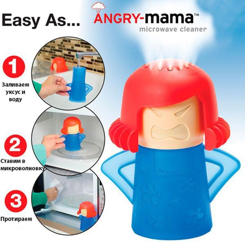 Все мы сталкивались с проблемой того, что приходится отмывать микроволновку изнутри. Облегчить и заметно ускорить этот трудоемкий процесс поможет очиститель для микроволновки Angry Mama. Теперь для того, чтобы привести вашу микроволновую печь в первозданно чистое состояние, вам достаточно налить в этот очиститель смесь уксуса и воды и поставить на пару минут разогреться в микроволновку. Затем останется всего лишь протереть грязь, которая теперь отойдет легко и быстро.