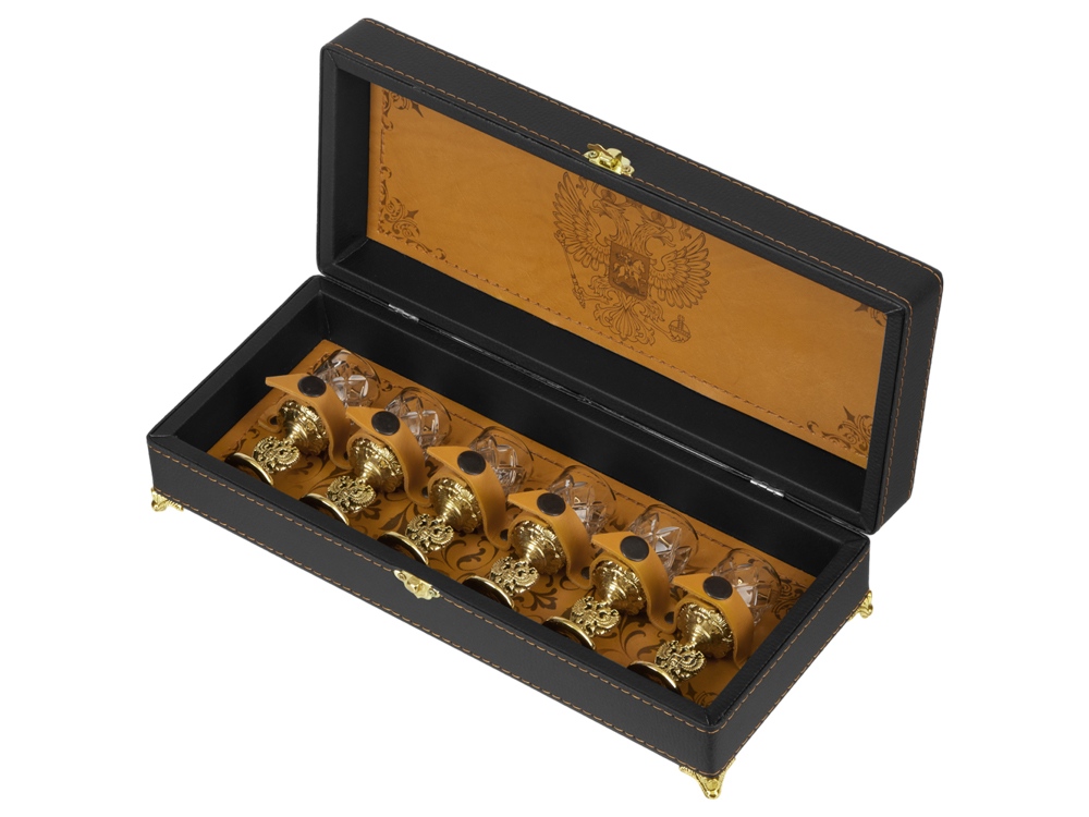 Футляр из эко-кожи, внутренняя отделка натуральная кожа рыжего цвета. Рисунок нанесен путем термообработки. В набор входит шесть стопок по 30 мл. Хрусталь, литьё.
